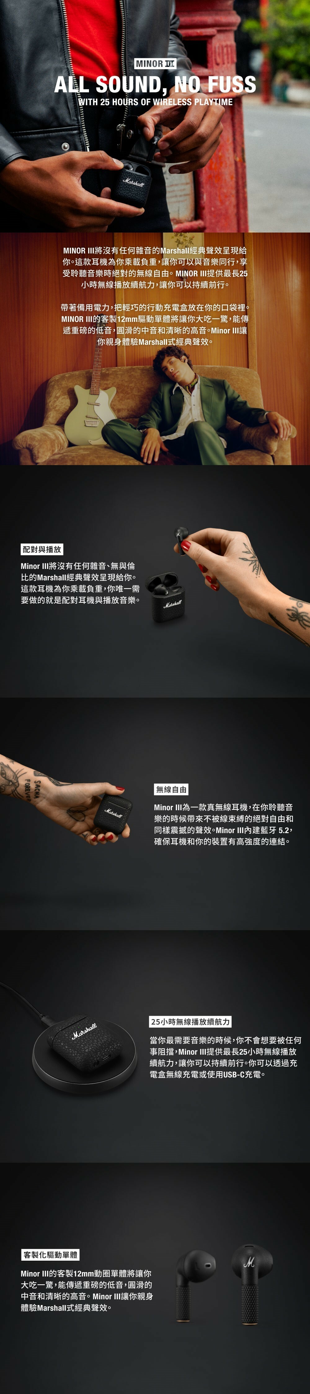 Minor III 能無拘束地為你帶來 Marshall 標誌性聲音。這款耳機設有觸控式設計,能助你完成所有繁複的操作,你只需戴上耳機,配對設備,調整音量即可外出,盡情投入音樂世界。